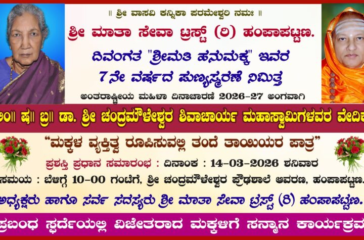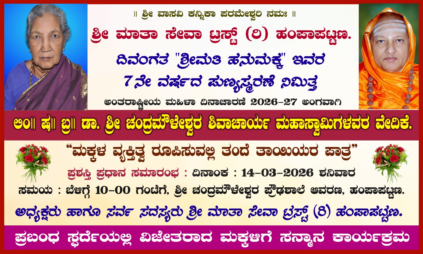 ಜೂಡಿ ನ್ಯೂಸ್ : ಅಂತರಾಷ್ಟ್ರೀಯ ಮಹಿಳಾ ದಿನಾಚರಣೆಯ ಅಂಗವಾಗಿ 09,03,2026ನೇ ಸೋಮವಾರದಂದು ಶ್ರೀ ಮಾತಾ ಸೇವಾ ಟ್ರಸ್ಟ್ (ರಿ)...