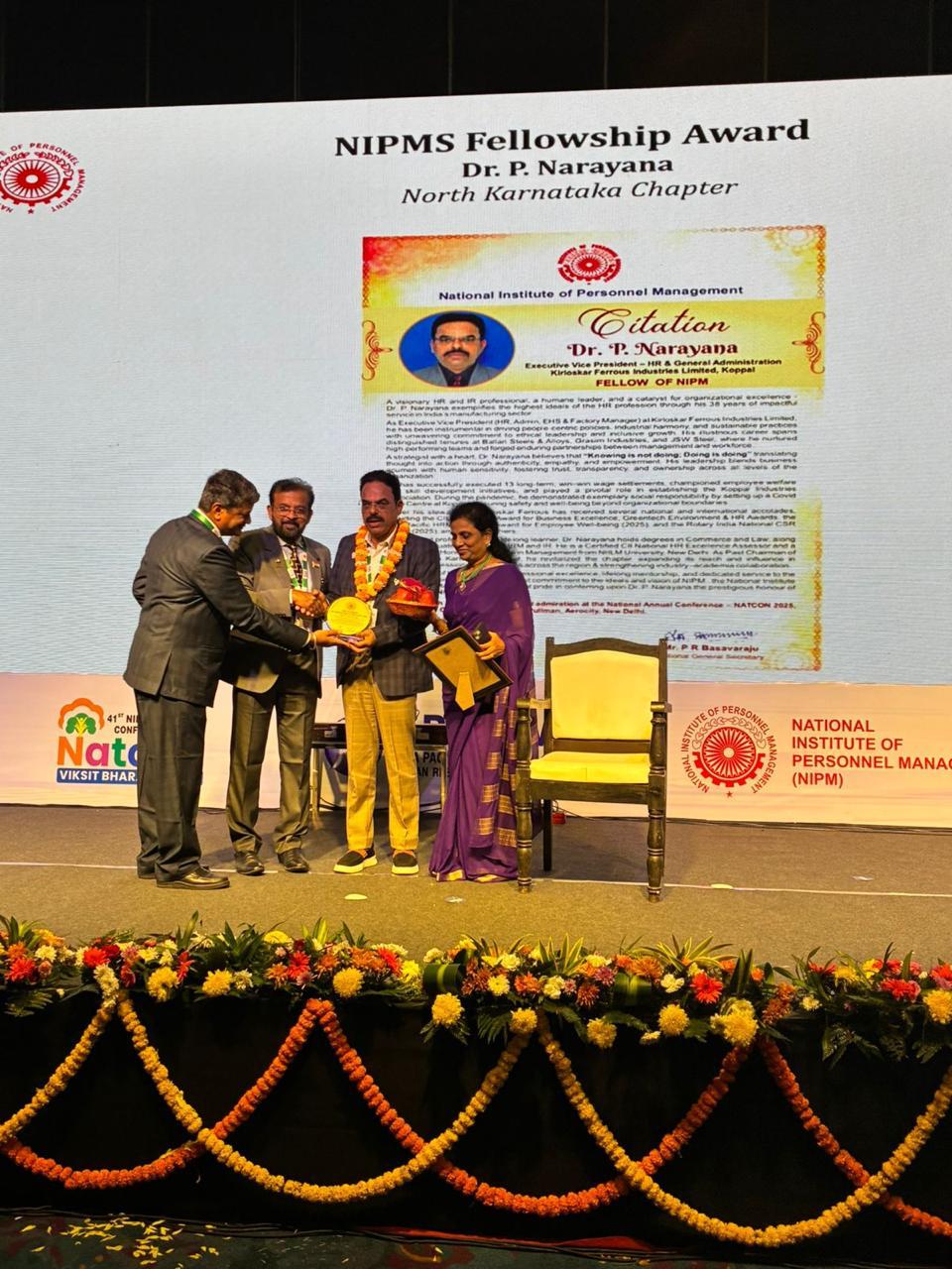 ಕೊಪ್ಪಳ : ಕಿರ್ಲೋಸ್ಕರ್ ಫೆರಸ್ ಇಂಡಸ್ಟ್ರೀಸ್ ಲಿಮಿಟೆಡ್, ಕೊಪ್ಪಳದ ಕಾರ್ಯನಿರ್ವಾಹಕ ಉಪಾಧ್ಯಕ್ಷರು ಮಾನವ ಸಂಪನ್ಮೂಲ ವಿಭಾಗ, ಆಡಳಿತ, ಇಹೆಚ್ಎಸ್ ಮತ್ತು ಕಾರ್ಖಾನೆ ವ್ಯವಸ್ಥಾಪಕ ರಾದ ಡಾ. ಪಿ.ನಾರಾಯಣ ಅವರಿಗೆ ರಾಷ್ಟ್ರೀಯ ಪರ್ಸ್ನಲ್ ಮ್ಯಾನೇಜ್ಮೆಂಟ್ ಇನ್ಸ್ಟಿಟ್ಯೂಟ್ (ಎನ್ಐಪಿಎಂ) ವತಿಯಿಂದ ಪ್ರತಿಷ್ಠತ ಫೆಲೋಶಿಪ್ ಪ್ರಶಸ್ತಿ 2025ರ ಅಕ್ಟೋಬರ್ 30 ರಂದು ನವದೆಹಲಿ ಏರೋಸಿಟಿಯ ಹೋಟೆಲ್ ಪುಲ್ಮ್ಯಾನ್ನಲ್ಲಿ ನಡೆದ “41ನೇ ಎನ್ಐಪಿಎಂ ರಾಷ್ಟ್ರೀಯ ಸಮ್ಮೇಳನ (ನ್ಯಾಟ್ಕಾನ್-2025) ನಲ್ಲಿ ಪ್ರಧಾನಿಸಲಾಯಿತು.