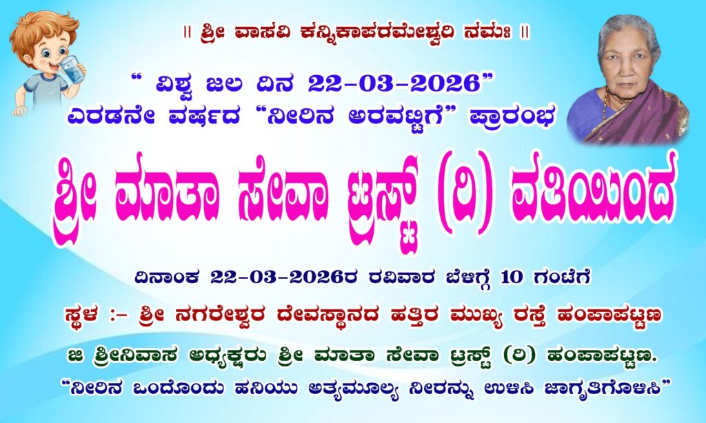 ಹಗರಿಬೊಮ್ಮನಹಳ್ಳಿ ತಾಲೂಕು ಹಂಪಾಪಟ್ಟಣ ಗ್ರಾಮದಲ್ಲಿ ದಿನಾಂಕ 22-03-2026 ರವಿವಾರದಂದು ವಿಶ್ವ ಜಲ ದಿನ”ದ ಅಂಗವಾಗಿ ಶ್ರೀ ನಗರೇಶ್ವರ ದೇವಸ್ಥಾನದ ಮುಂಭಾಗದಲ್ಲಿ ಸಾರ್ವಜನಿಕರ ಅನುಕೂಲಕ್ಕಾಗಿ ಎರಡನೇ ವರ್ಷದ ನೀರಿನ ಅರವಟ್ಟಿಗೆ ಯನ್ನು ಪ್ರಾರಂಭಿಸಲಾಯಿತು.